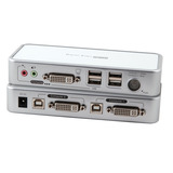 2-Port KVM Switch USB-DVI-D/A- Audio-USB2.0 Hub incl. Kabelset Steuert 2 DVI/USB-PC mit voller Audio-Unterstützung Port Auswahl via Switching Software Client, definierbaren Hotkeys oder Select Taste Die USB-Ports für Keyboard/Mouse entsprechen einem USB2.0 Hub Separate Portschaltung für KVM, USB und Audio Unterstützt Videosignale DVI-I Digital und DVI-I Analog Multi-Plattform Unterstützung HDCP kompatibel Auto Scan Modus Im Lieferumfang: 2 x Kabelsatz 1.2 m, 1 x Software-CD, 1 x Netzteil