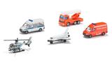 Dieses Geschenkset besteht aus vier Nutzfahrzeugen und einem Hubschrauber von SIKU.