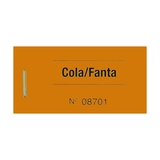 Gutscheinmarke "Cola" orange. Aus Papier. 100 Abrisse auf Block, fortlaufend nummeriert. Links geheftet und perforiert. Mit Kartonrückwand. Größe: 60 x 30 mm